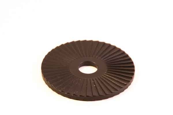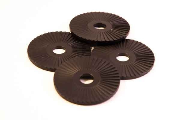 Kunststof geribbelde schijven met een doorsnede van 50mm, 3mm dik met een gat van 10mm doorsnede.